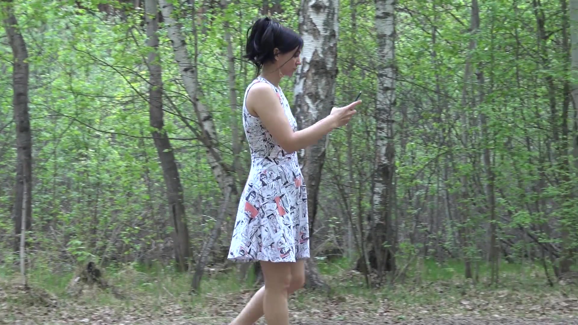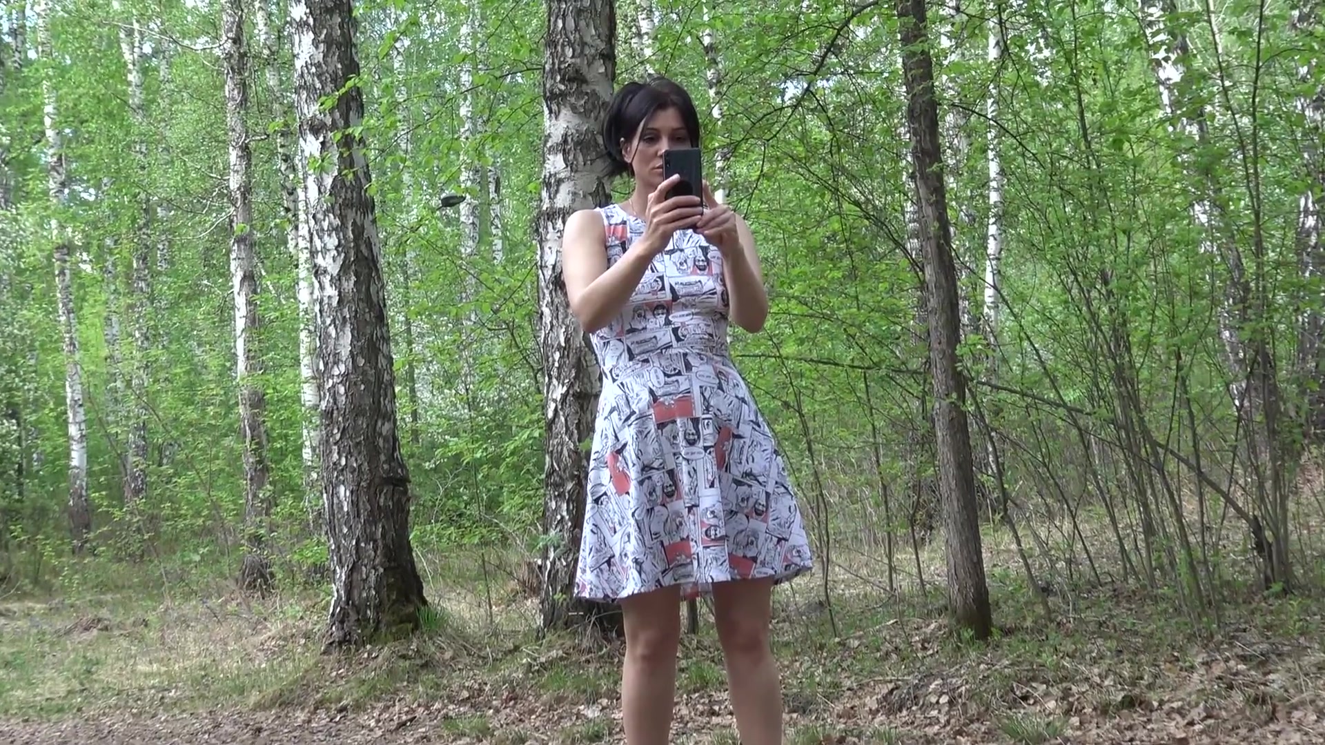 Сексуальная русская милфа Кристина гуляет парком в легком летнем платье без трусиков. Брюнетка обожает прогулки без нижнего белья, она мечтает о том, что на пути ей встретиться большой твердый член и вставит ей в горячую киску без каких-то либо препятствий. Красотка прогуливается между березок и мастурбирует заросшую киску. Есть желающие трахнуть эту горячую русскую сучку на свежем воздухе средь бела дня?